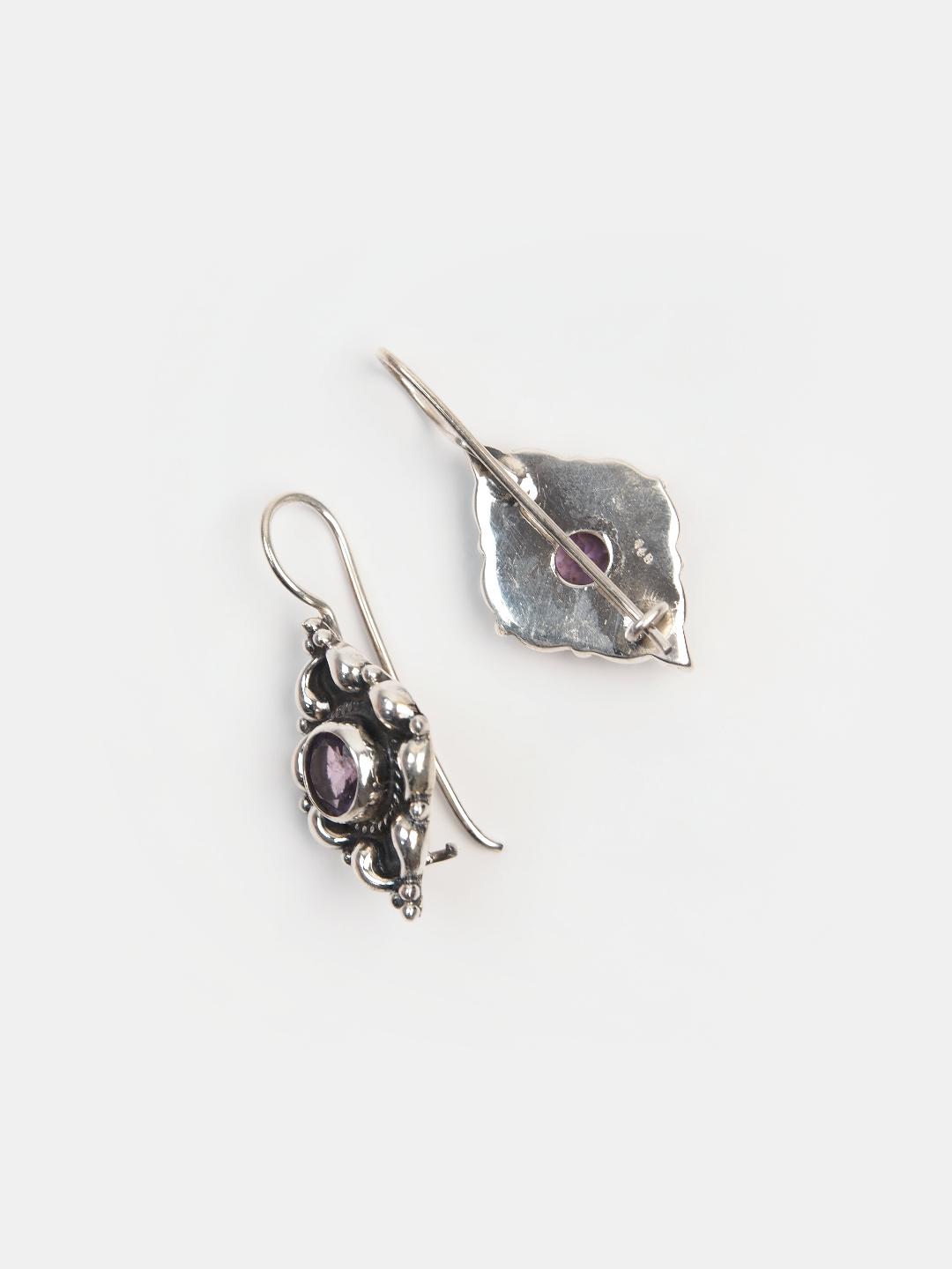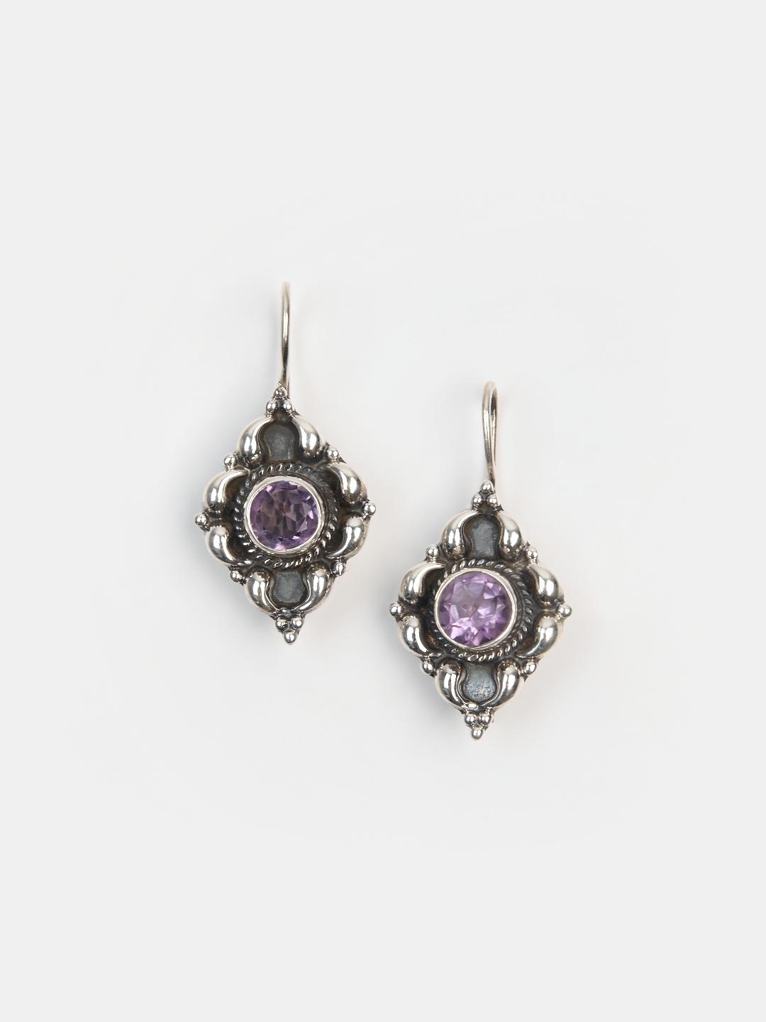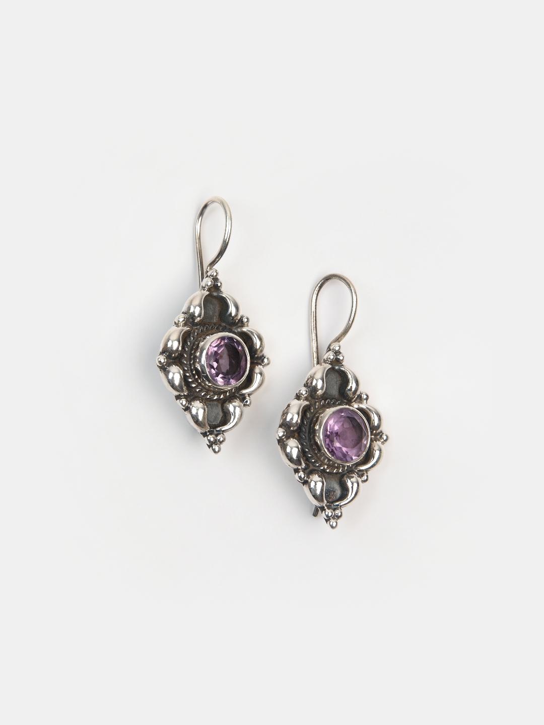 Cercei din argint 925 și ametist fațetat, lucrați manual în India. Deosebit de feminini, cerceii Hiran au o montură elegantă, clasică, și o tortiță cu închizătoare foarte practică. Însă punctul lor forte este superbul ametist fațetat din centru, pus în valoare de către floarea stilizată a monturii care îl înconjoară.