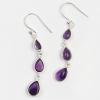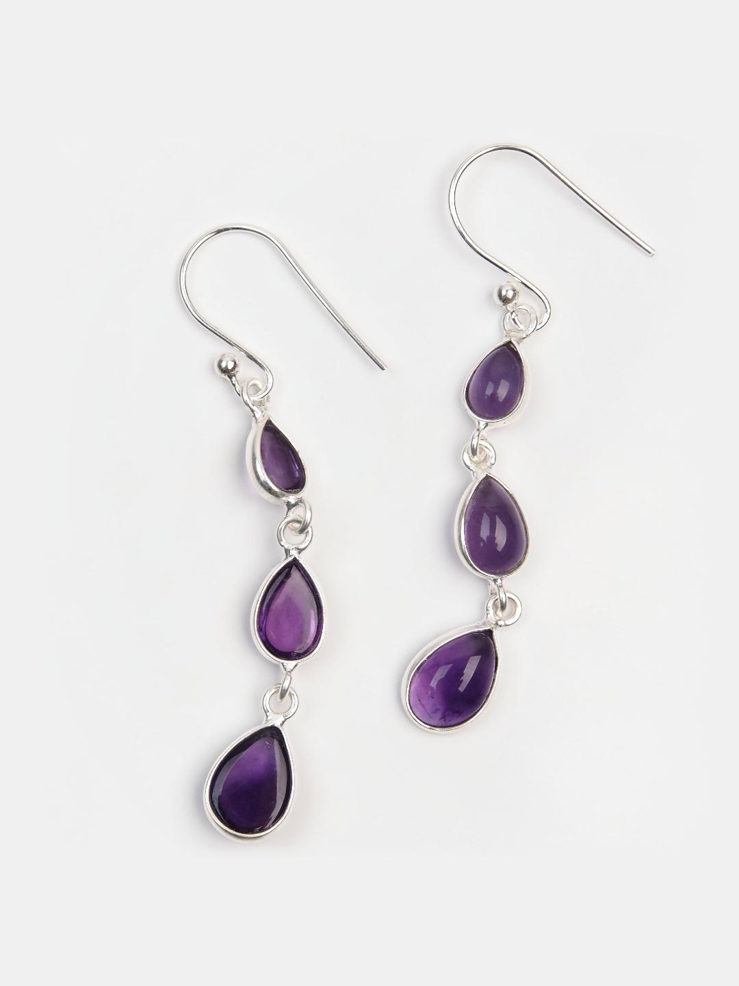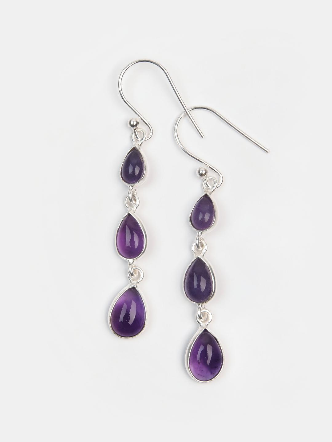 Cercei din argint 925 și ametist natural caboșon, lucrați manual în India. Trei picături fermecătoare de ametist, prinse între ele într-o montură fină, delicată. Cerceii Saraswati te vor încânta la fiecare purtare cu mișcarea lor delicată și nuanța splendidă a ametistului.