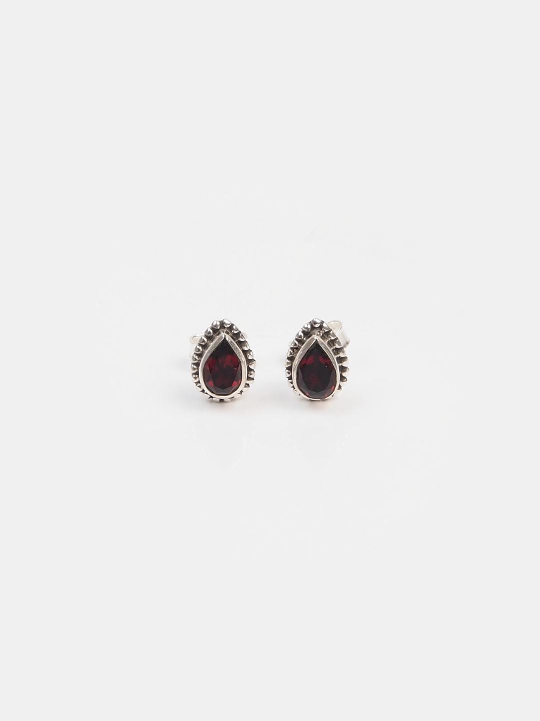 Cercei cu șurubel din argint 925 și granat fațetat, lucrați manual în India. Cu o montură delicată, în formă de lacrimă, și două superbe granate fațetate într-o montură cu mici detalii de granulație de jur împrejur, cercelușii Yoni arată minunat la ureche.