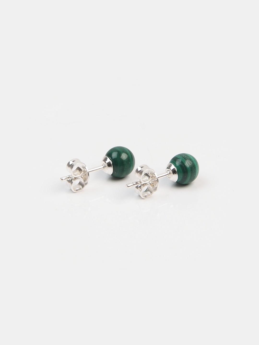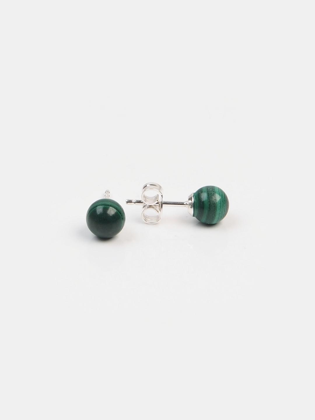 Cercei cu șurubel din argint 925 și malachit, lucrați manual în India. Două mărgeluțe fermecătoare de malachit, perfect rotunde și fără montură vizibilă, se vor așeza minunat la urechi.