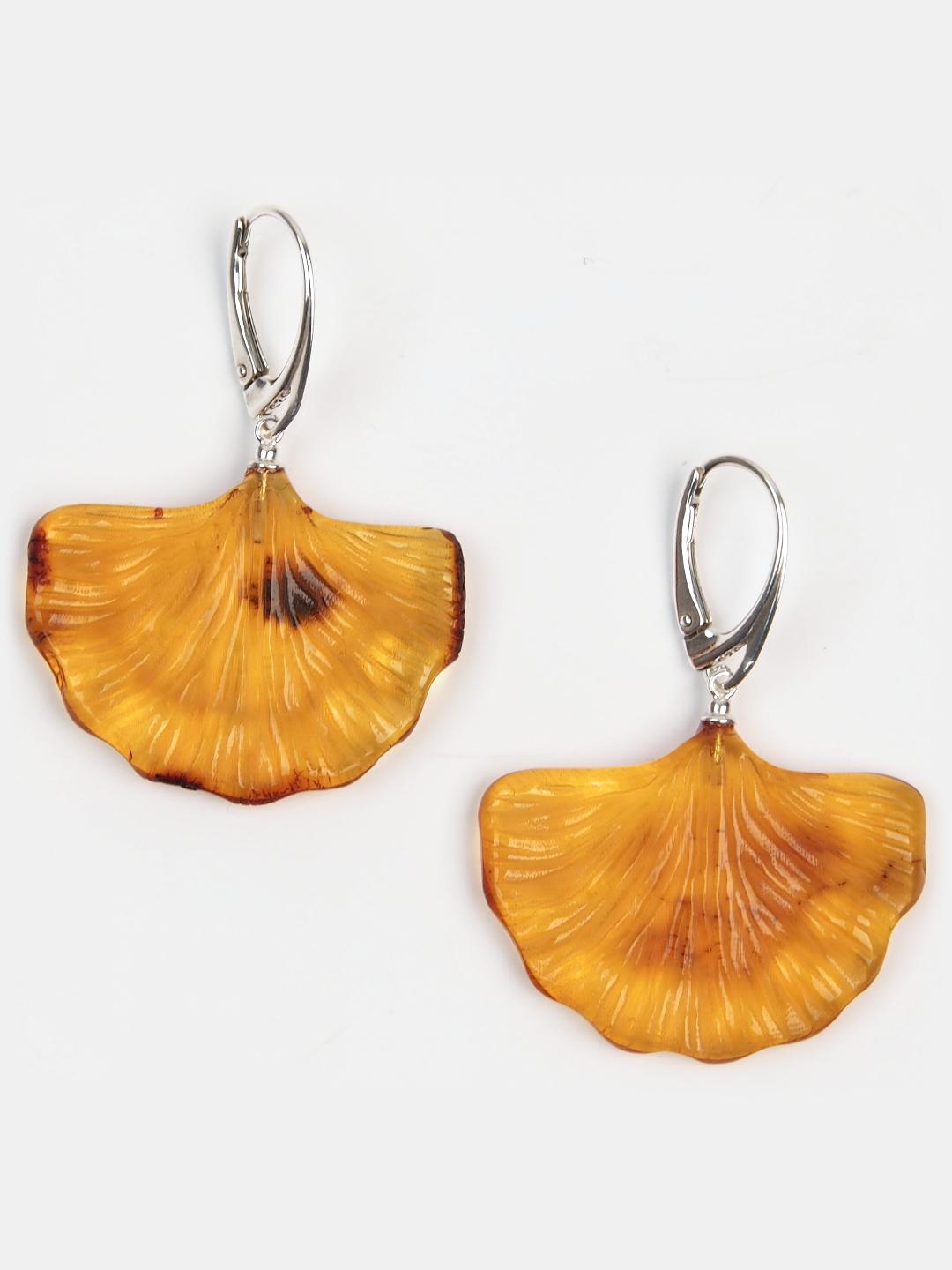 Cercei unicat din chihlimbar natural baltic și argint 925. O pereche superbă de cercei sculptați în forma frunzei de Ginko biloba, cerceii arată absolut spectaculos și sunt ușori, comozi și siguri datorită închizătoarei ideale pentru acest model.