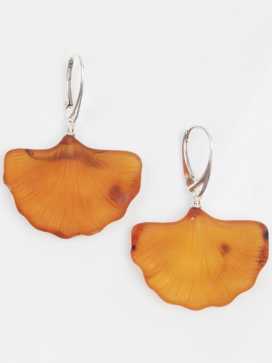 Cercei unicat din chihlimbar natural baltic și argint 925. O pereche superbă de cercei sculptați în forma frunzei de Ginko biloba, cerceii arată absolut spectaculos și sunt ușori, comozi și siguri datorită închizătoarei ideale pentru acest model.