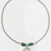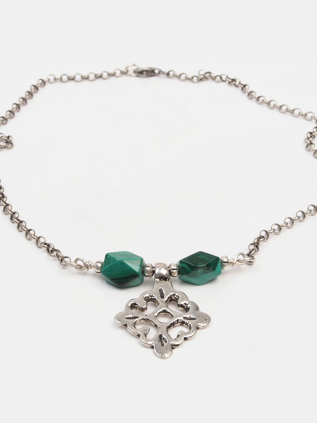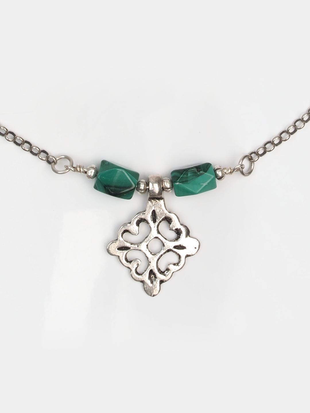 Un model aparte, la colierul Amrit privirea este atrasă în primul rând de irezistibilul malachit, tăiat manual într-o formă geometrică deosebită, cu douăsprezece fețe, numită dodecaedru. Tăietură inedită, executată de un priceput meșter pietrar indian, pune în valoare minunat nuanțele splendide ale malachitului și dungile tipice pietrei, și creează un contrast reușit cu pandantivul din argint, dar și cu restul colierului.