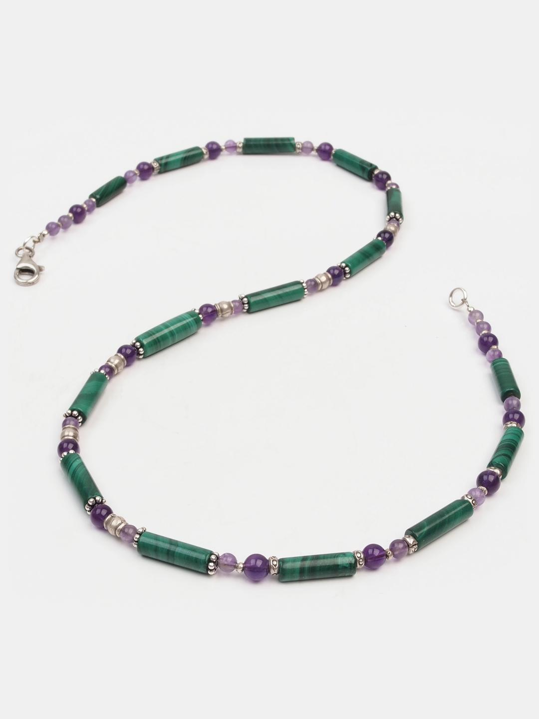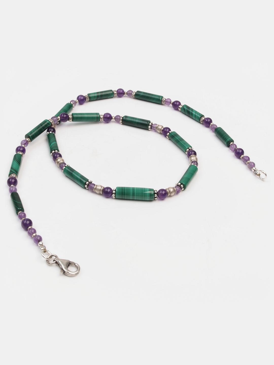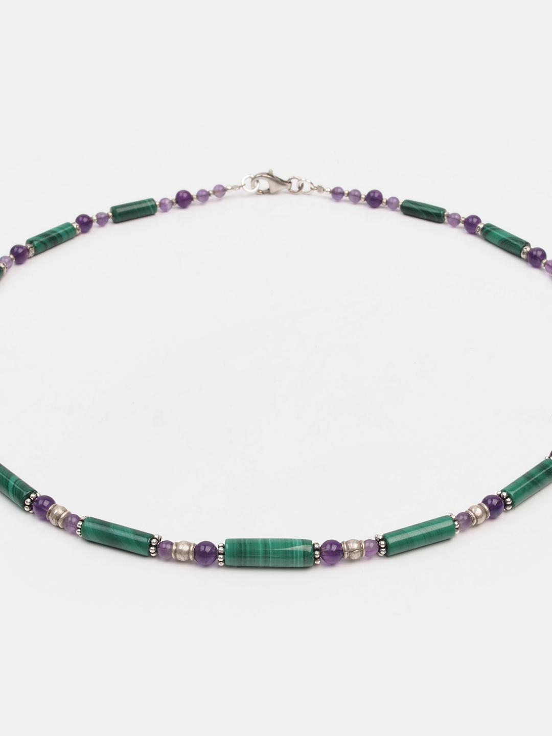 Colier din malachit, ametist și argint 925. Model unicat Metaphora, lucrat manual în serie limitată.