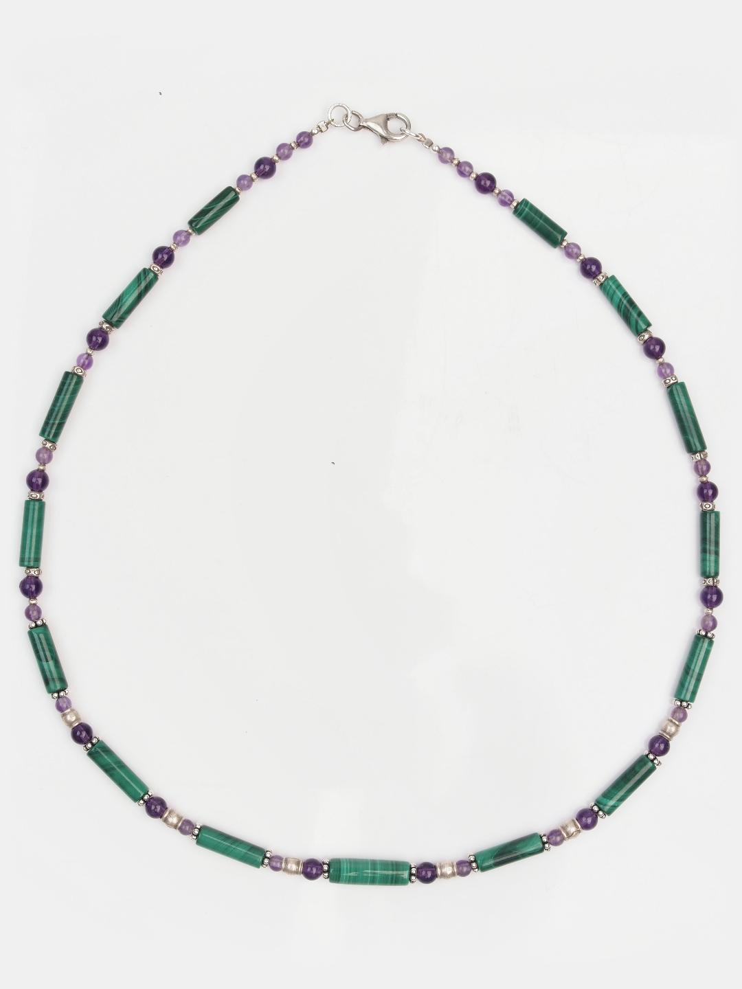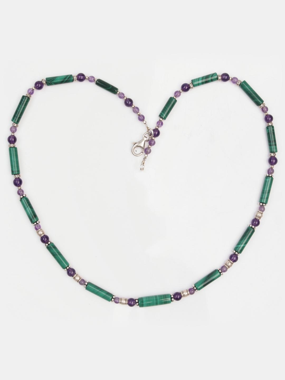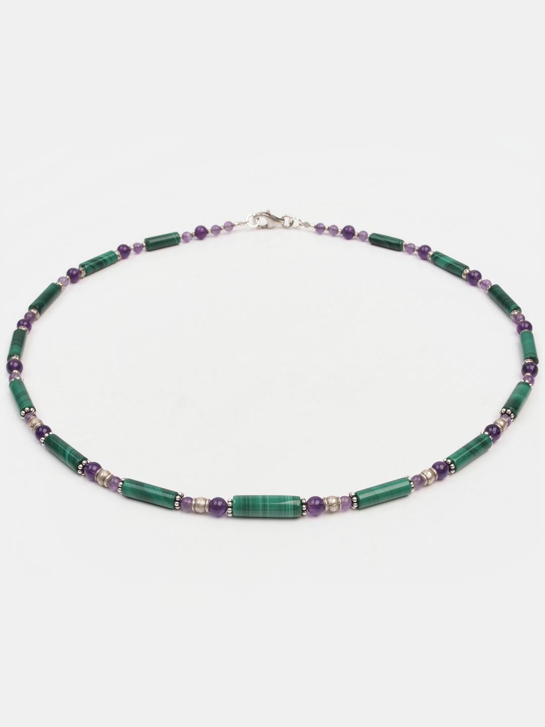 Colier din malachit, ametist și argint 925. Model unicat Metaphora, lucrat manual în serie limitată.