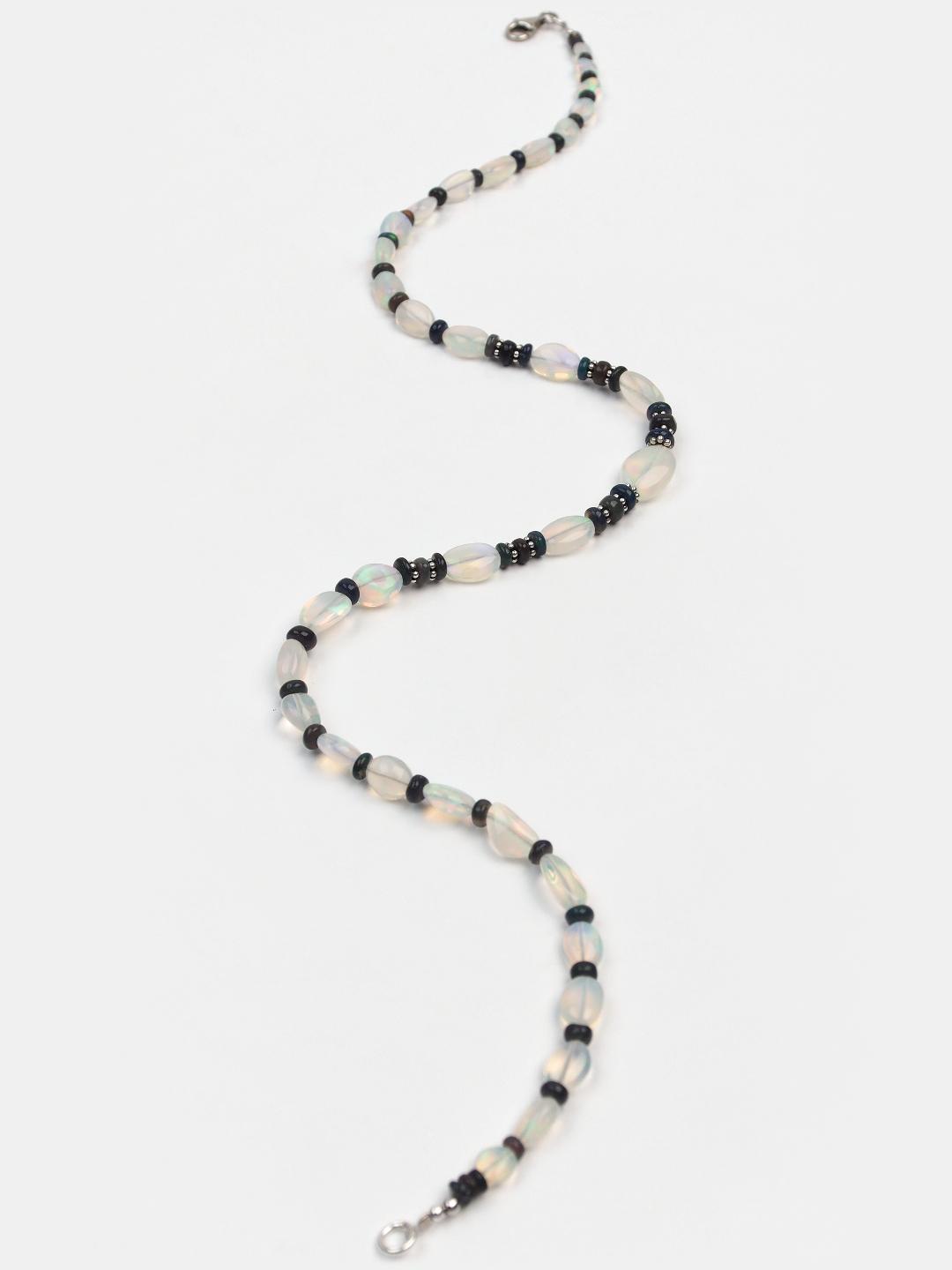 Colier din opal etiopian natural în două culori și argint 925. Model unicat Metaphora, lucrat manual în serie limitată. Colierul Shewa este lucrat din două tipuri de opal – Wollo, de formă ovală neregulată, cu o dimensiune care scade treptat către capete și mici accente de opal Shewa, tăiat în discuri rotunjite.