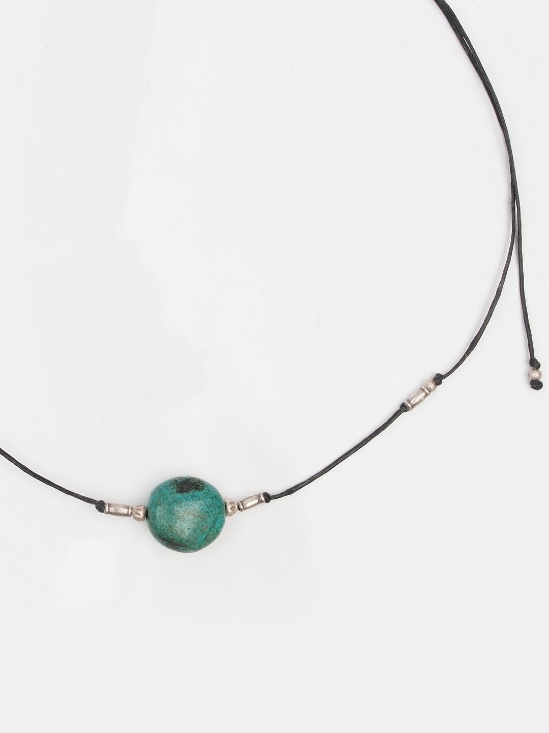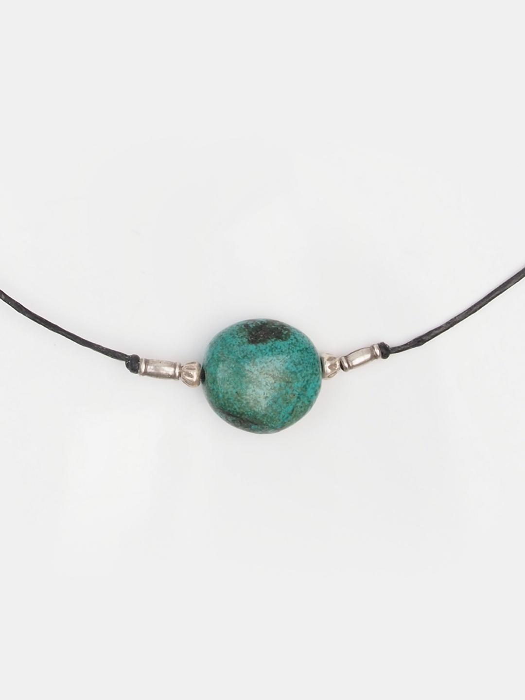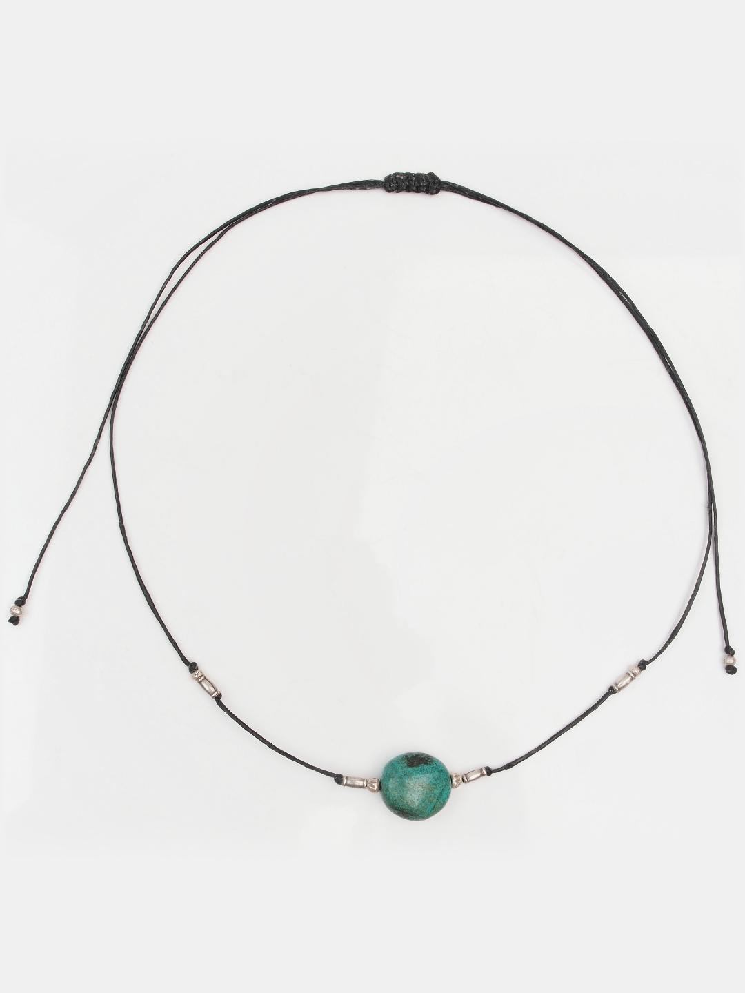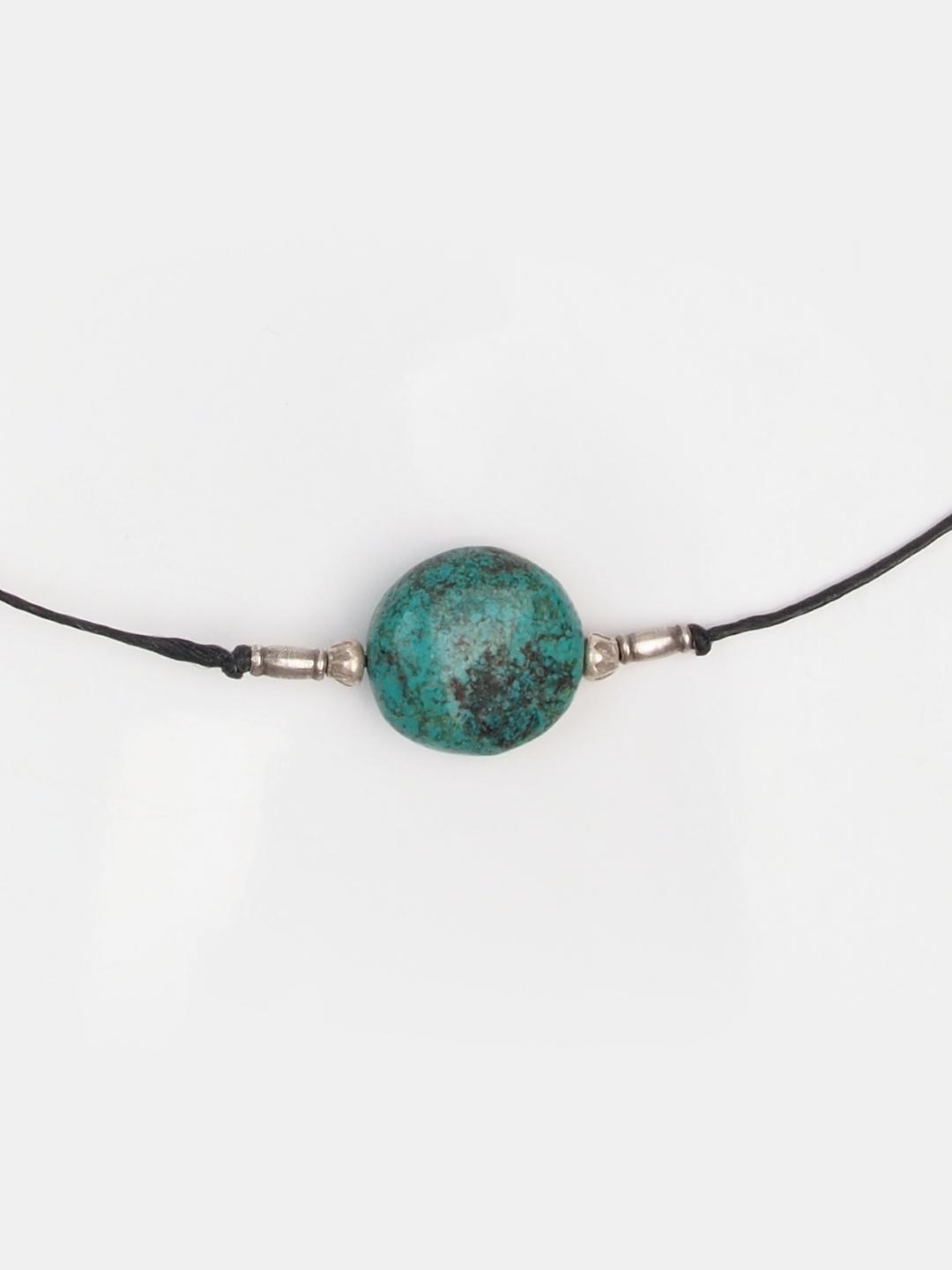 De o simplitate cuceritoare, colierul din turcoaz tibetan are un farmec atemporal. Șnurul negru cerat, punctat de mici elemente din argint converge către centrul colierului și se ajustează la gât astfel încât lungimea să se potrivească oricui.