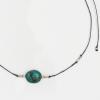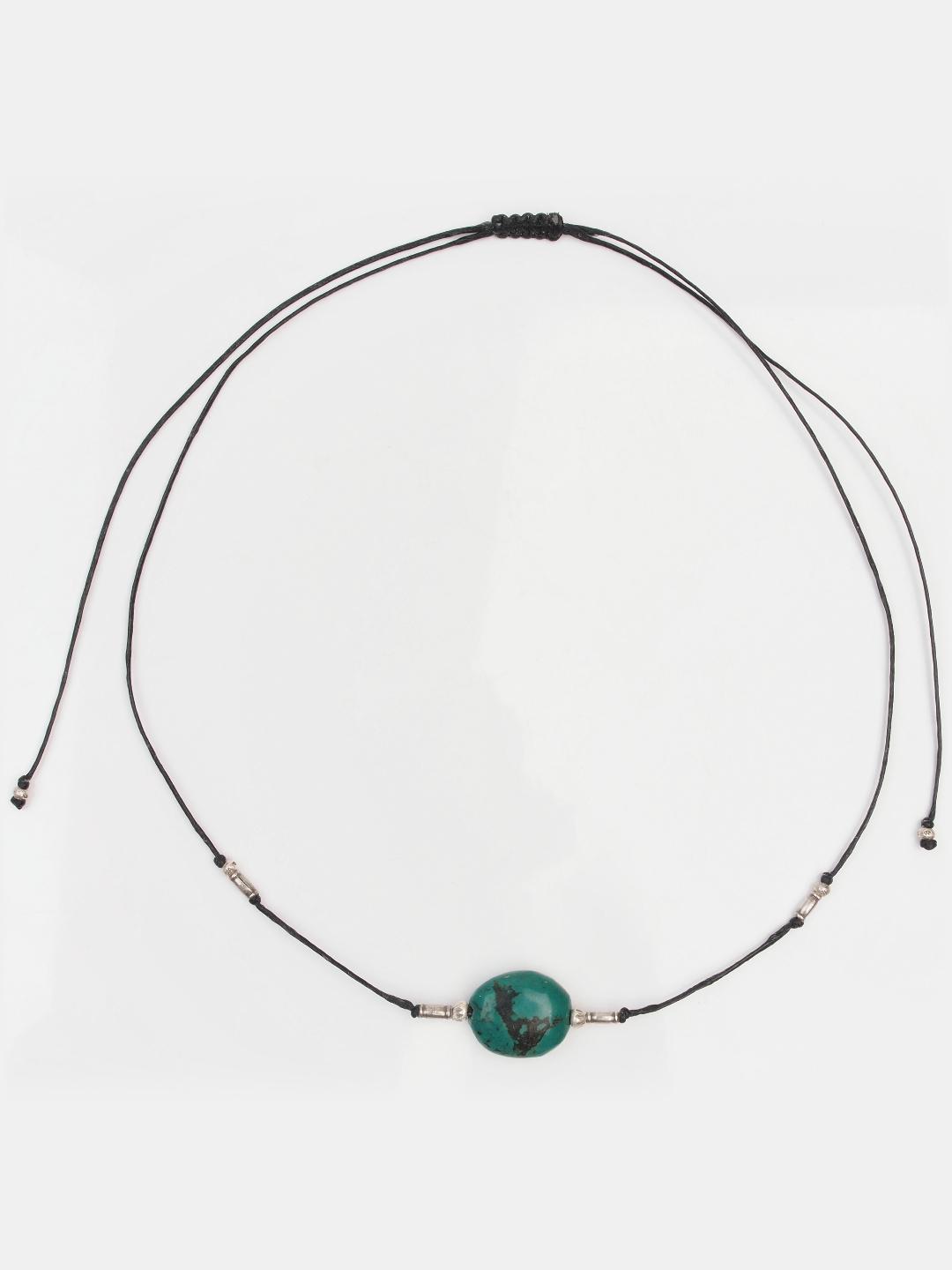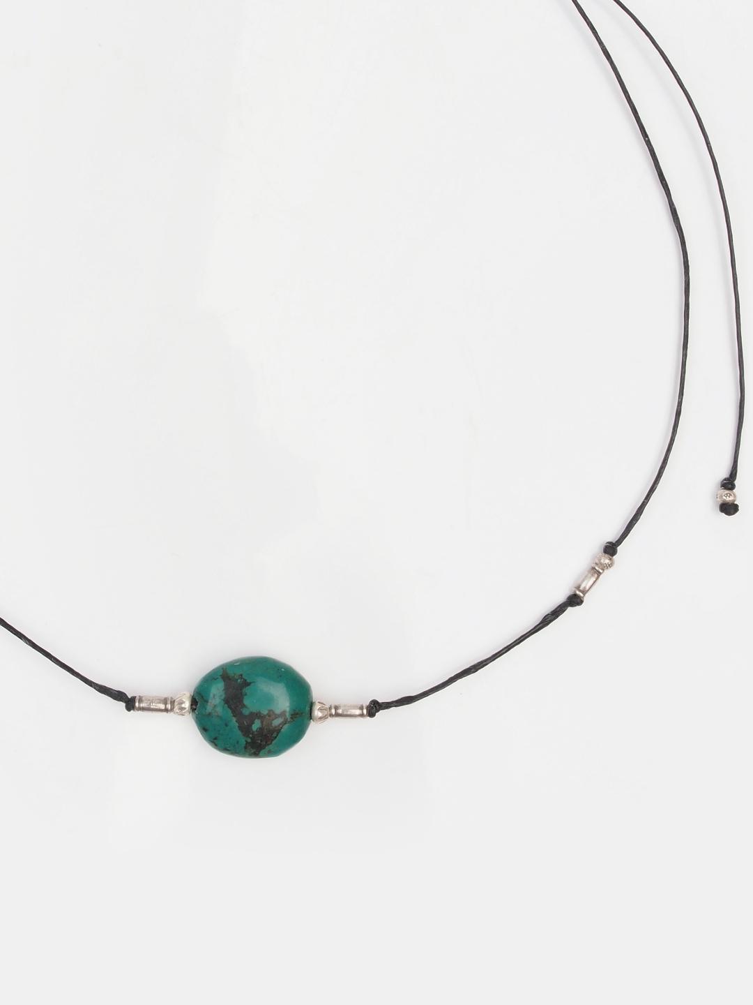De o simplitate cuceritoare, colierul din turcoaz tibetan are un farmec atemporal. Șnurul negru cerat, punctat de mici elemente din argint converge către centrul colierului și se ajustează la gât astfel încât lungimea să se potrivească oricui.