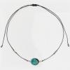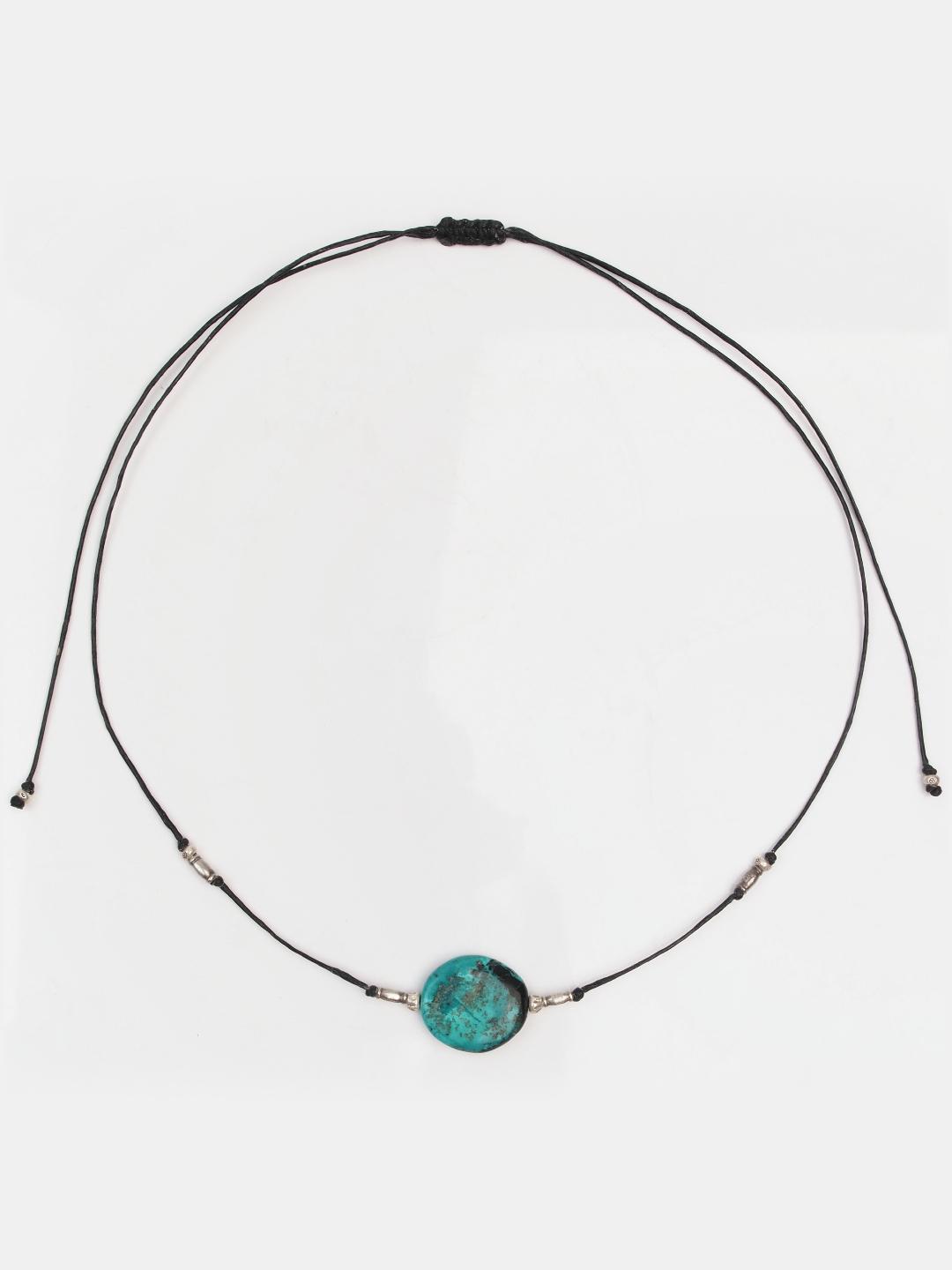 De o simplitate cuceritoare, colierul din turcoaz tibetan are un farmec atemporal. Șnurul negru cerat, punctat de mici elemente din argint converge către centrul colierului și se ajustează la gât astfel încât lungimea să se potrivească oricui.