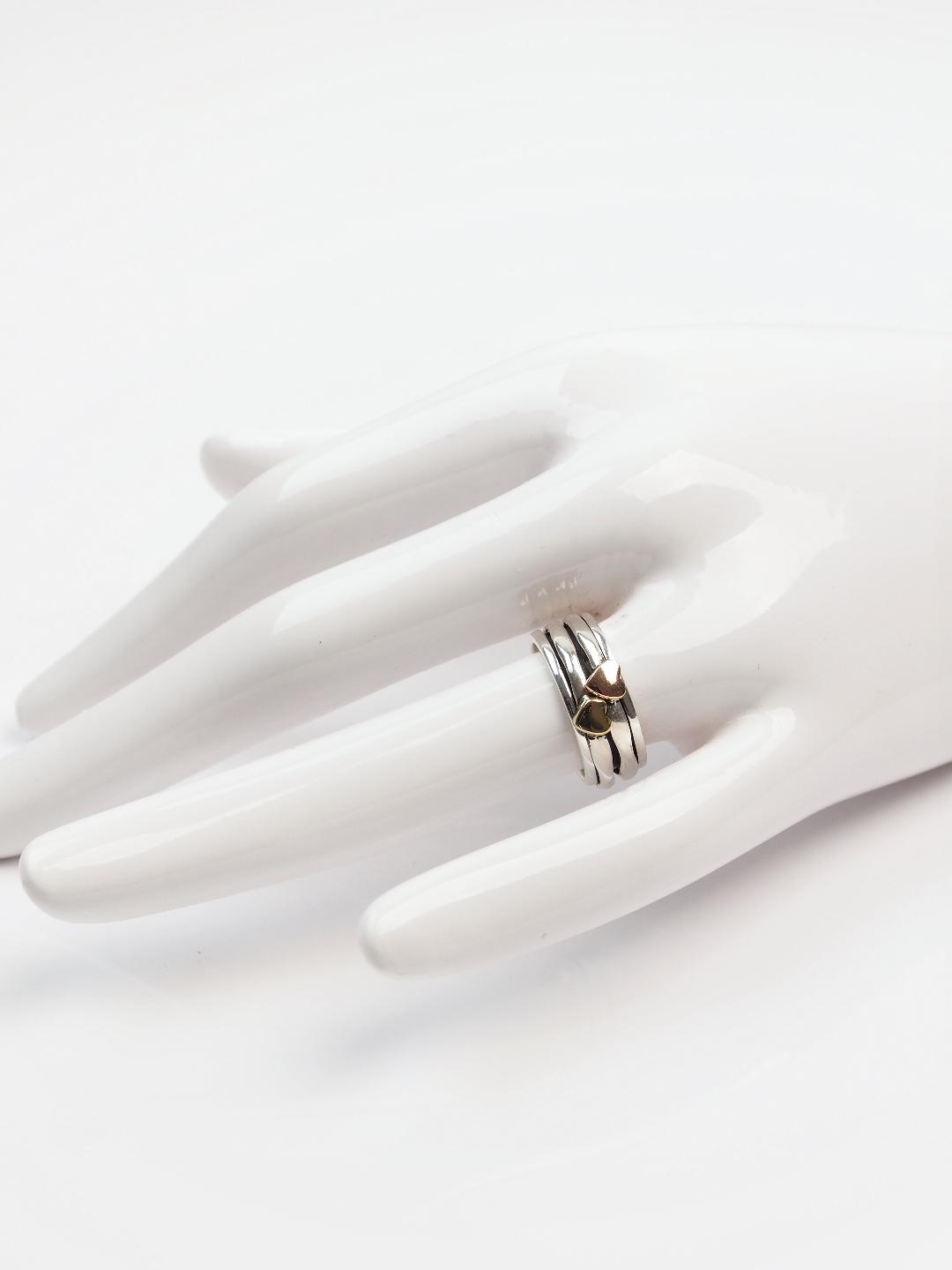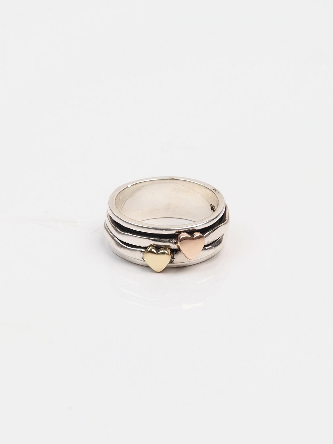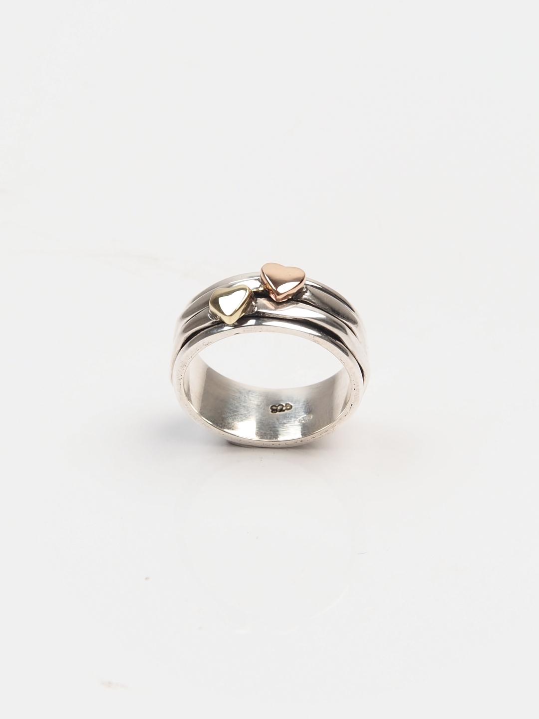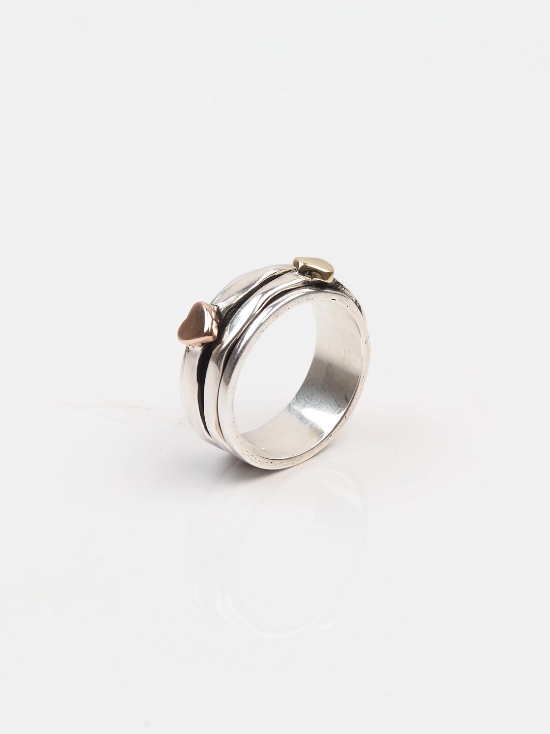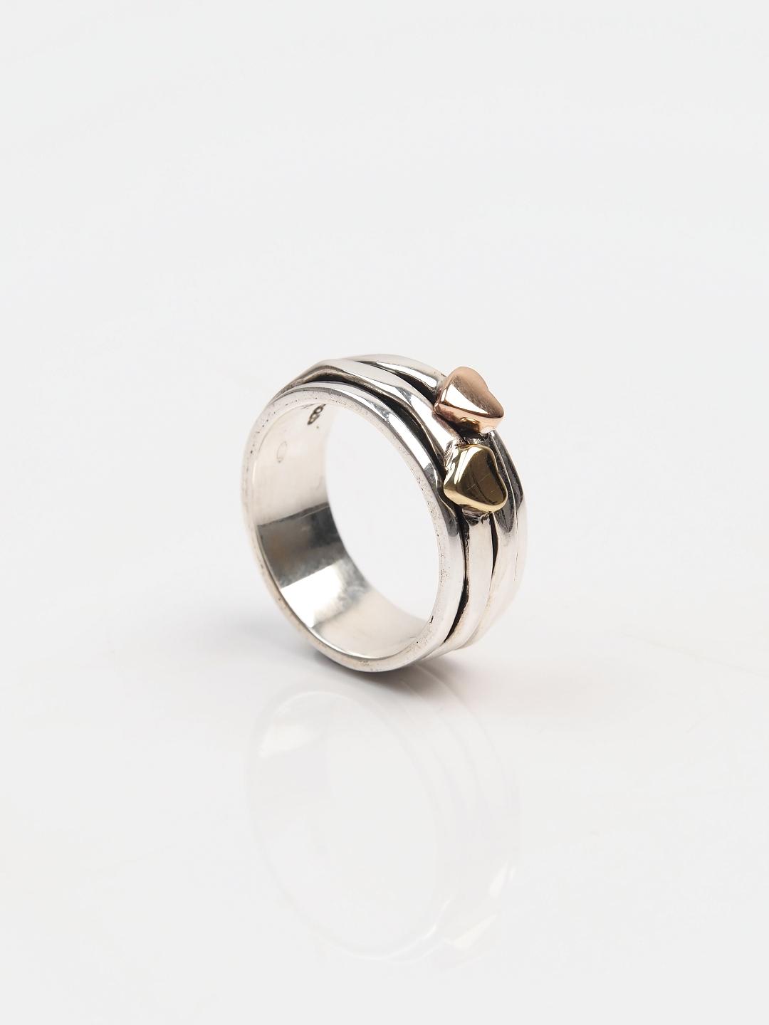 Inel antistress din argint 925, cu inimioare din bronz și cupru, lucrat manual în India în serie mică.