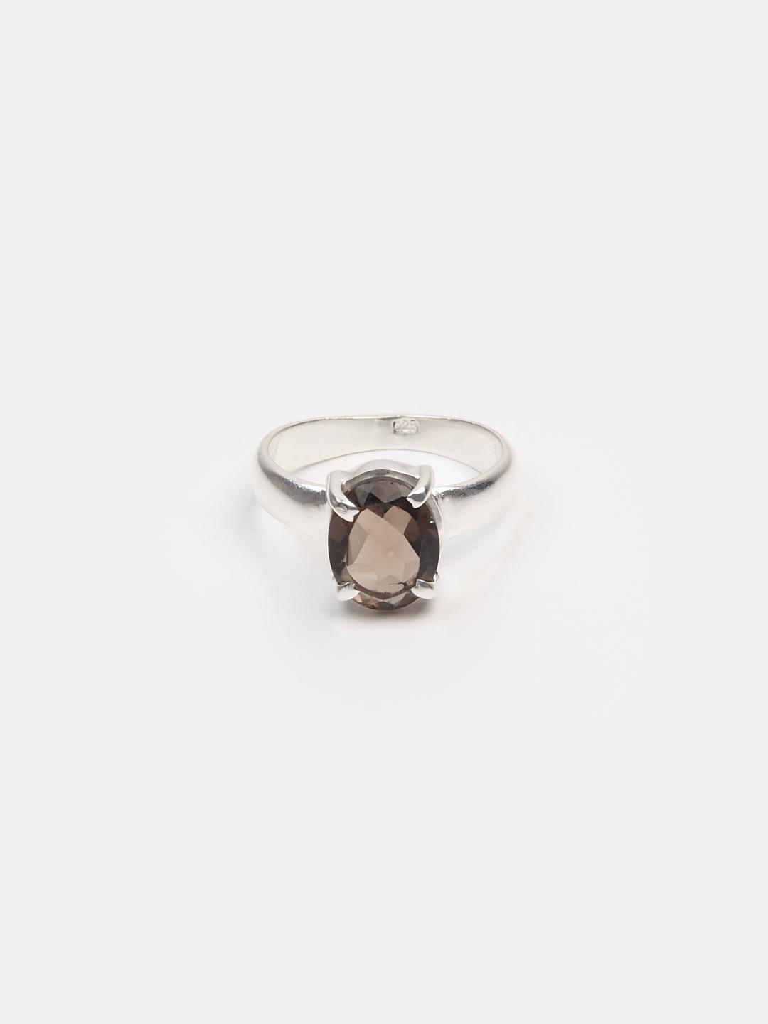 Inel din argint 925 și cuarț fumuriu fațetat, lucrat manual în India. Un model delicat și elegant, inelul Lahiri are o montură simplă, cu gheruțe, care pune în valoare cuarțul fațetat.