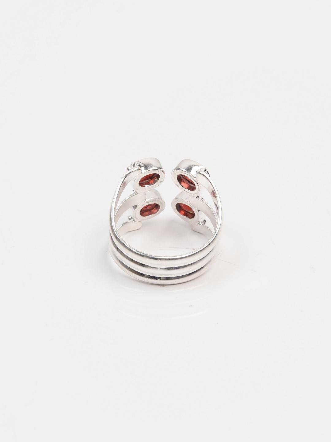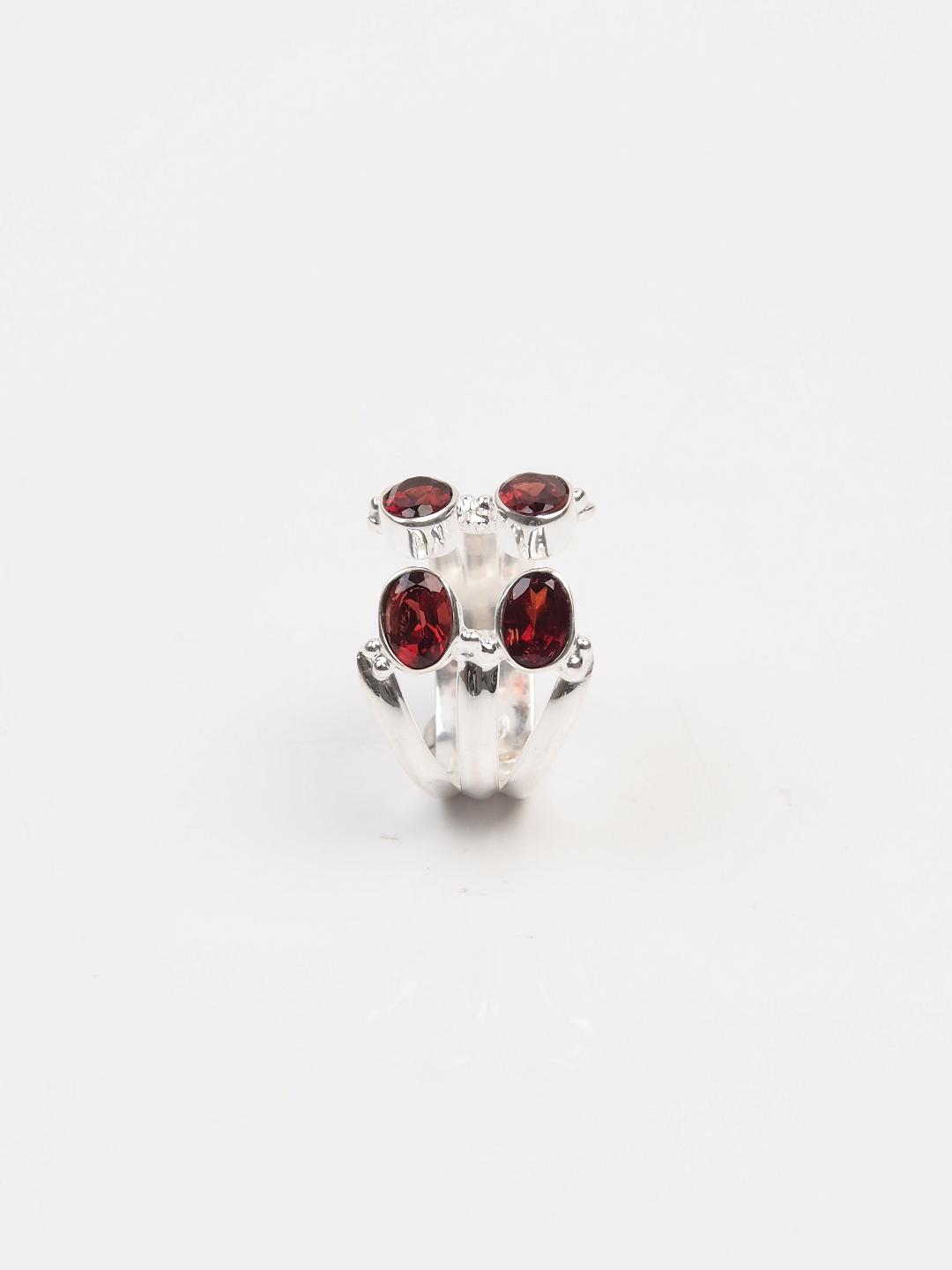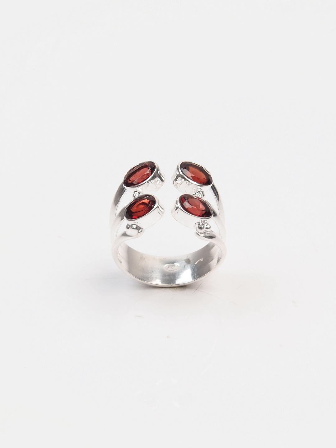 Inel din argint 925 și granat natural fațetat, lucrat manual în India. Un model elegant și feminin, inelul Malik are o montură fină, care pune minunat în valoare cele patru granate fațetate de către un șlefuitor de pietre indian. Montura delicată este deschisă în partea superioară, inelul putând fi lărgit un pic.