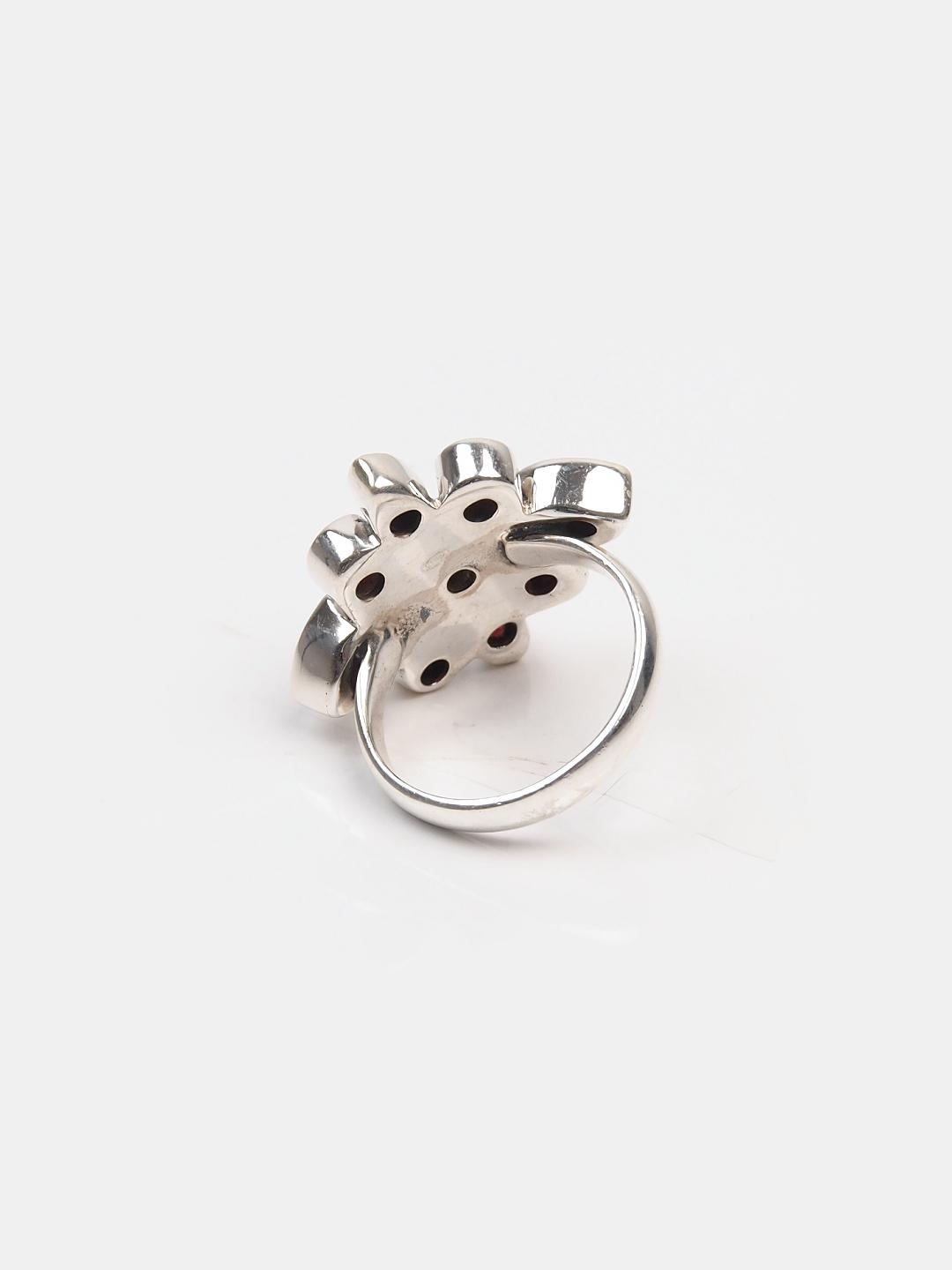 Inel din argint 925, perlă naturală și granat natural fațetat, lucrat manual în India. Un model deosebit de elegant, Inelul Vikriti are o montură complexă, de tip casetă, în care sunt montate opt superbe granate fațetate manual de către un șlefuitor de pietre indian și o perlă de apă dulce. Inelul este foarte feminin, iar combinația granat cu perlă este una deosebit de elegantă, care va înnobila orice ținută.