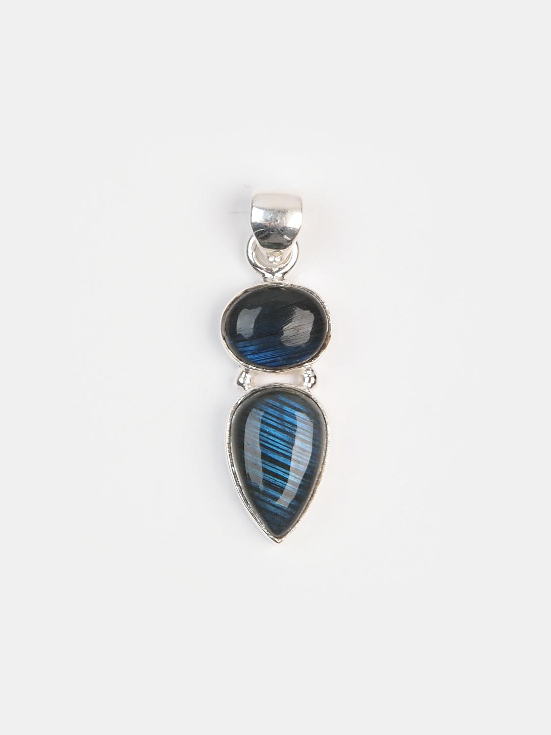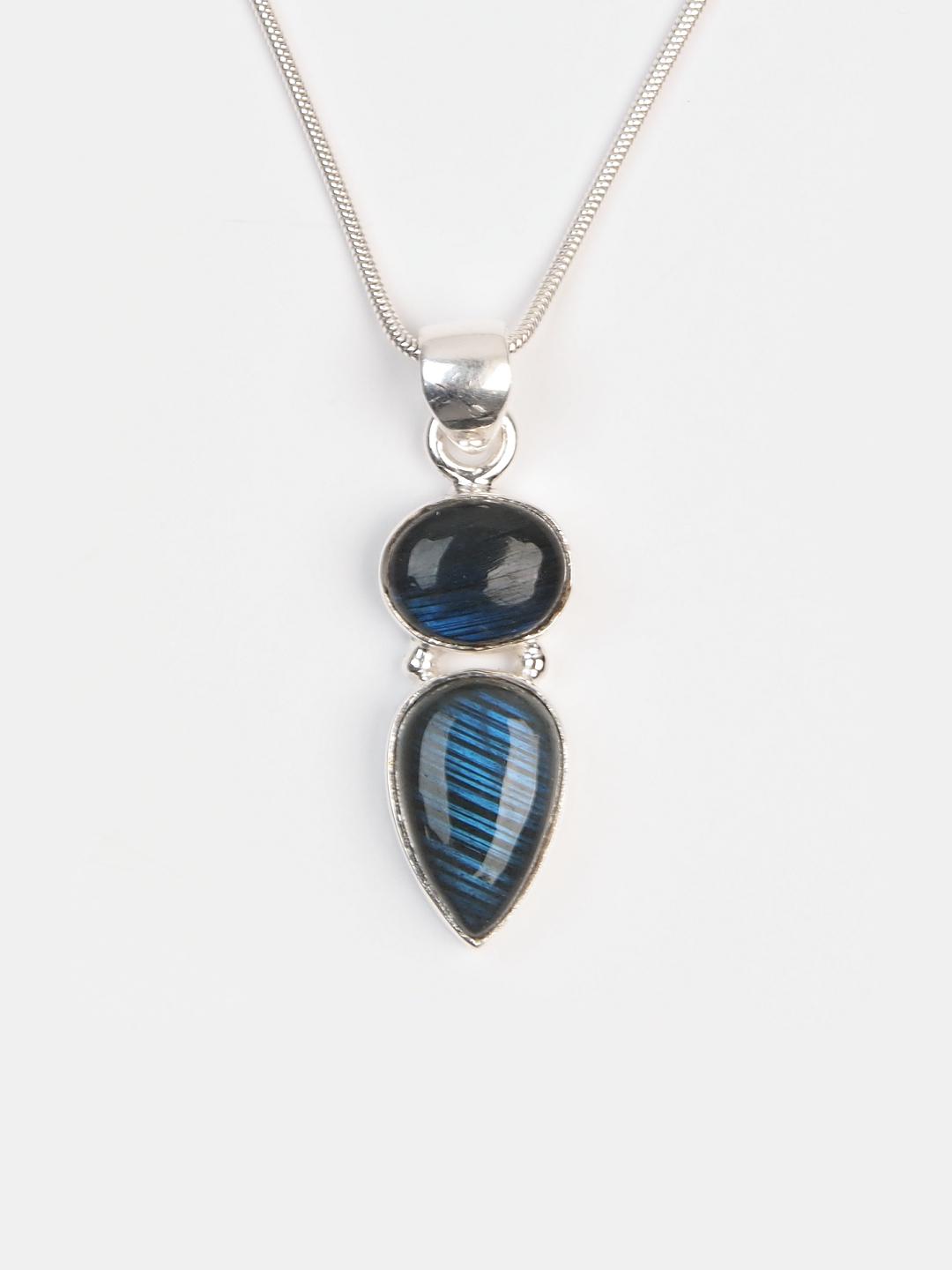 Pandantiv din argint 925 și labradorit, lucrat manual în India în serie mică. Elegant și cu o montură fină, pandantivul Djali are două caboșoane splendide de labradorit, în nuanțe albastru-gri, care te vor cuceri la prima vedere.