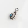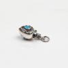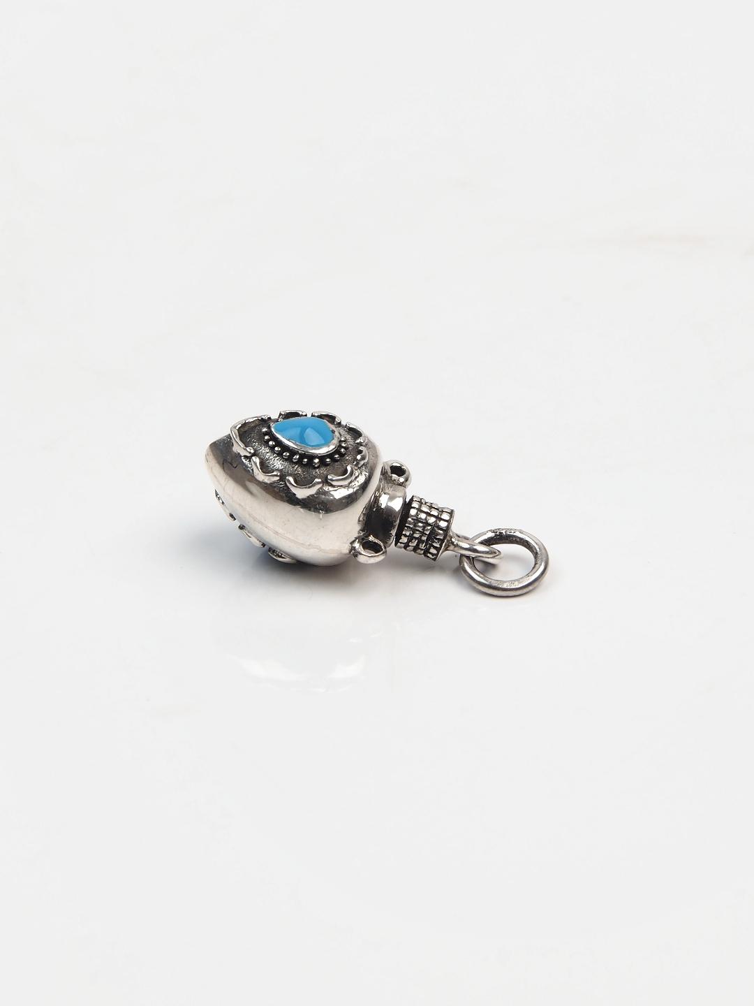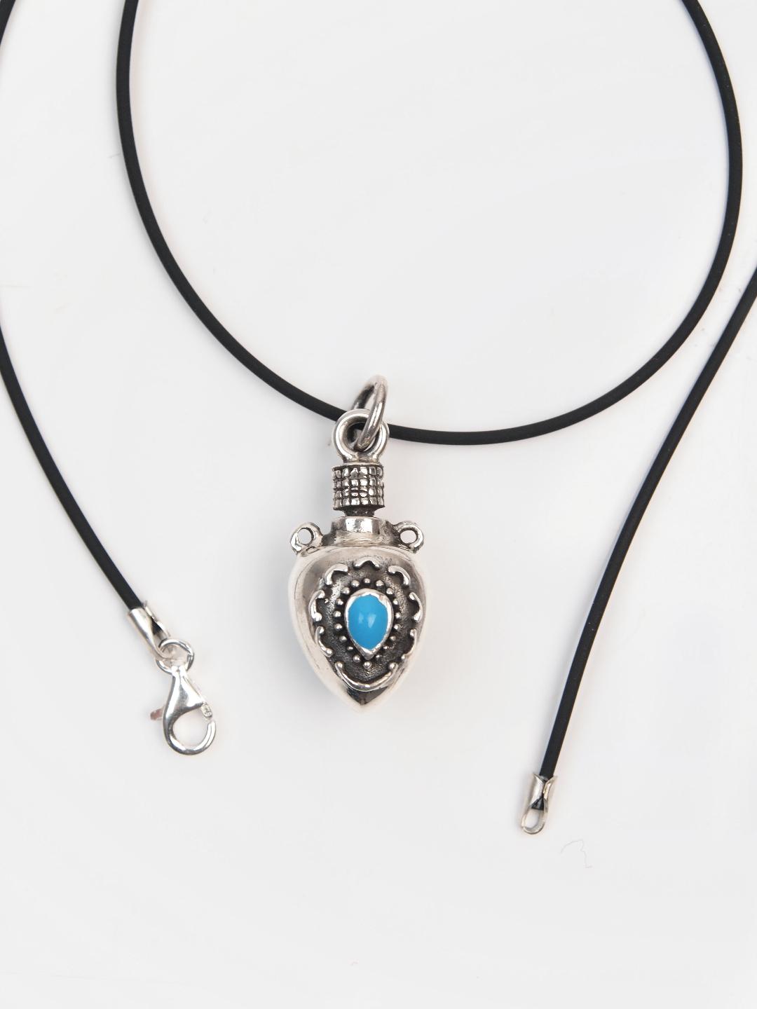 Pandantiv din argint 925 și haolit, lucrat manual în India. Pandantivul are o formă foarte frumoasă, de inimioară, și este de fapt un recipient, o sticluță miniaturală pentru parfum. Partea de sus, de sub anou este un căpăcel care se închide cu filet. Pandantivul a fost patinat ușor pentru a-i pune în valoare forma și volumul și în centru, pe ambele fețe, are un mic haolit în formă de picătură.