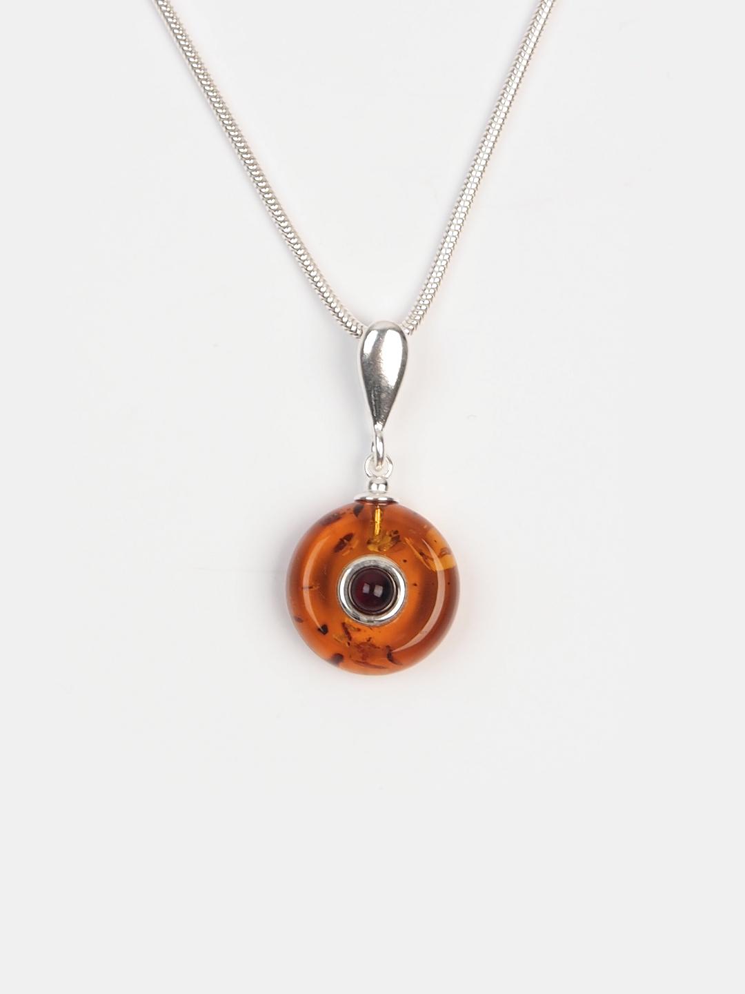 Pandantiv unicat din chihlimbar natural baltic și argint 925. Micuț și delicat, pandantivul din chihlimbar de culoarea coniacului are în centru, în motură din argint, un foarte mic chihlimbar de culoarea vinului roșu – o adevărată beție cromatică. Anoul care susține micuțul pandantiv este fin, ușor alungit, și pune foarte frumos în valoare chihlimbarul.
